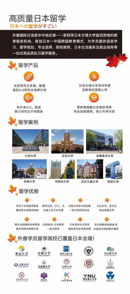 这样的优势是,对学员的成绩要求较低,所以如果条件一般的同学,可以参考这个途径赴日留学,时间充裕,从高考后到明年1月赴日,有充分的时间提高日语水平,外唐网校小编将这一方案推荐给基础较为一般的同学。