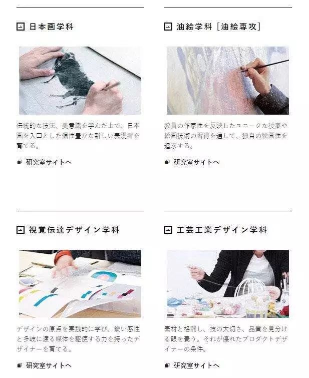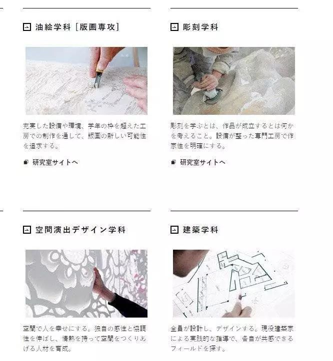 美术专攻:日本画、油画、版画、雕塑、造型理论&美术史、艺术文化政策。